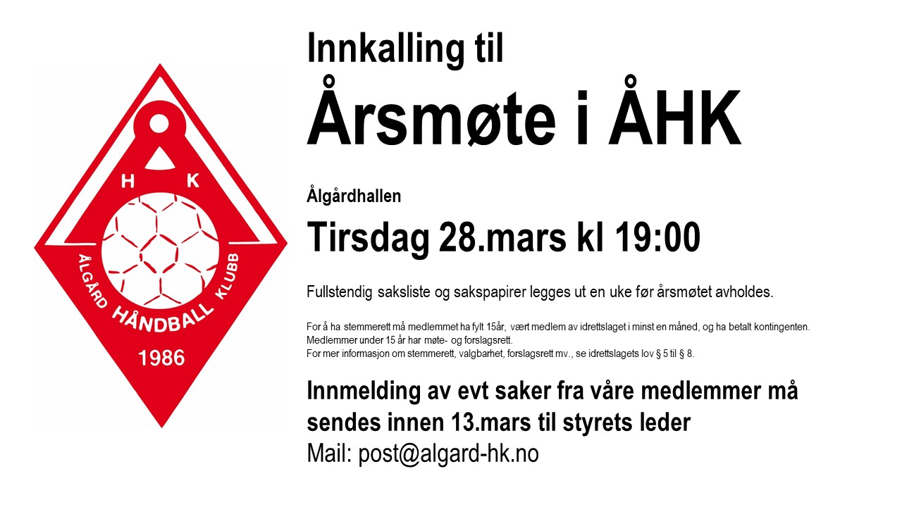 Ålgård Håndballklubb ønsker alle som vil delta velkommen på vårt Årsmøte for 2022
